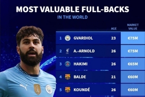 网上百家乐官方网站-边卫德转身价榜:格瓦、阿诺德7500万欧居首,阿什拉夫第三
