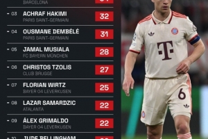 本赛季欧冠创造机会榜:基米希36次居首,拉菲尼亚34次位居次席