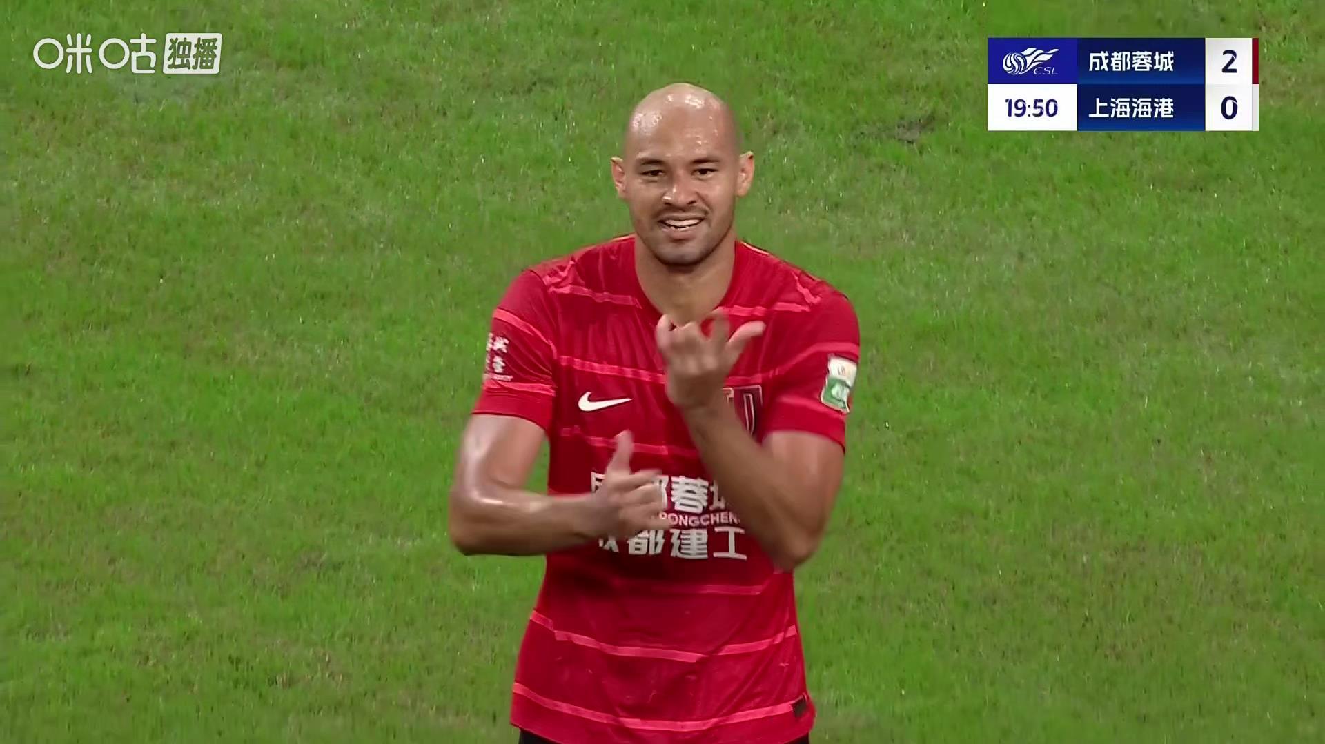 破僵的成都蓉城一发不可收拾,尽管第18分钟罗慕洛的进球因越位在先被吹,但仅1分钟之后,上港防线便再次犯错,王燊超禁区冒顶,古尔芬克尔抢下球权后传中,费利佩后点包抄推射空门得手,成都蓉城将比分扩大为2-0。