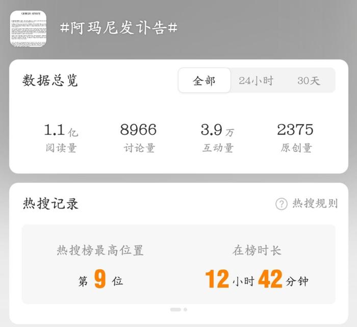 因此,这次阿玛尼先生去世的消息,迅速引起了网友的关注,#阿玛尼先生去世#和#阿玛尼发讣告#两个话题双双冲上了热搜高位,引发网友热议。