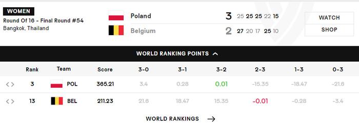 从数据上看比利时还跟波兰有差距,总得分112-99比利时、进攻65-52比利时、拦网15-10比利时、发球7-10比利时、自失27-25比利时,换言之只有一项是比利时占优的。